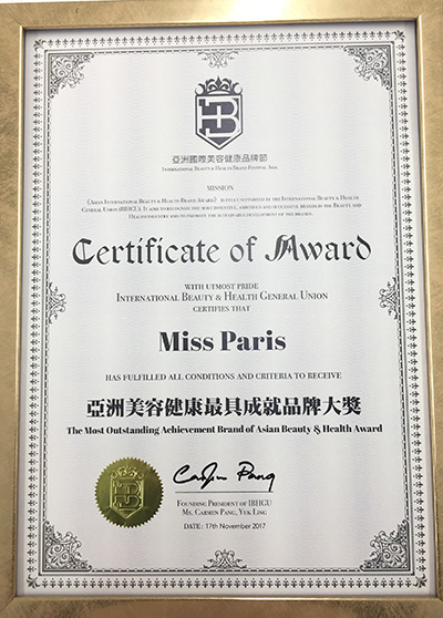 また、美や健康に関係する様々な賞の発表もあり、その中で2017年『アジアで最も影響力のあるブランド賞(The Most Outstanding Achievement Brand of Asia Beauty & Health Award)』としてミス・パリ・グループ(所在地:東京都中央区銀座、代表:下村 朱美)が選ばれ、受賞いたしました。