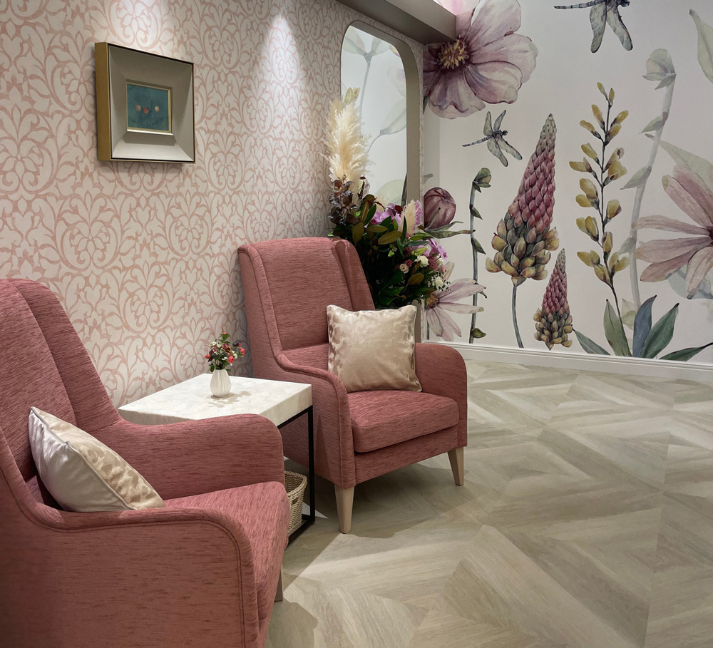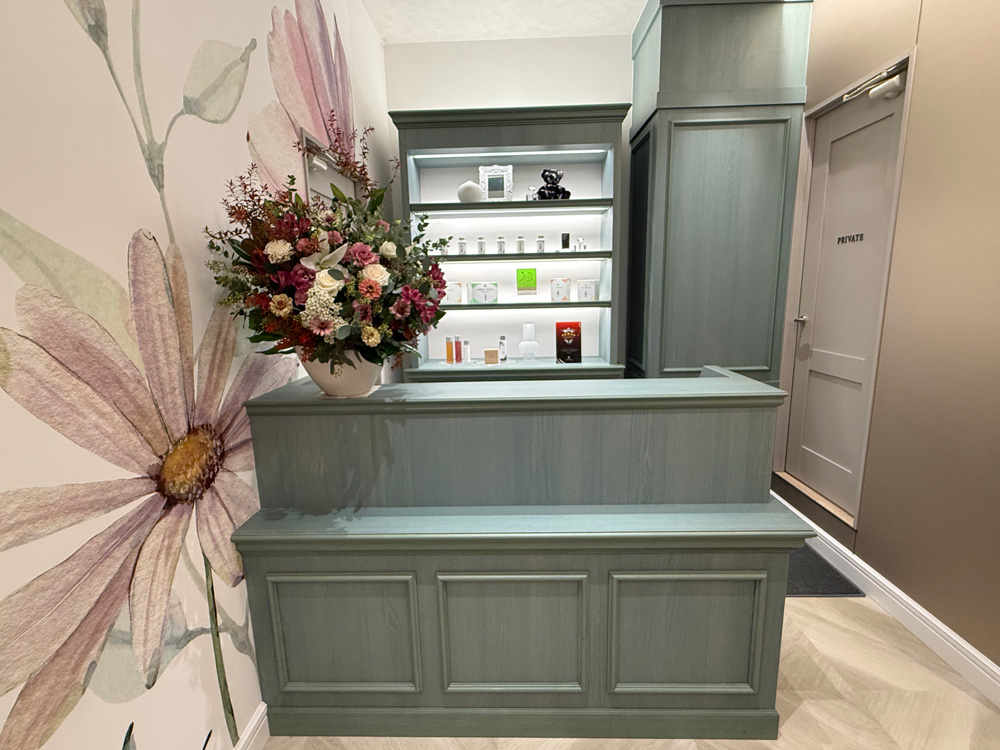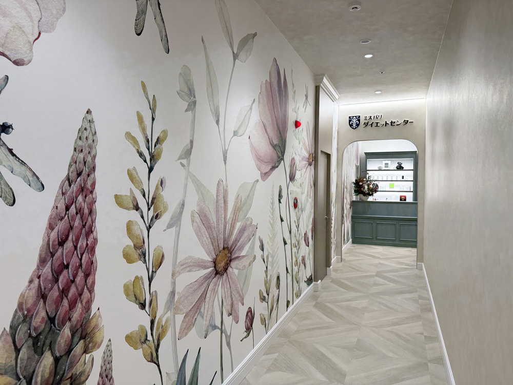 店内へと続く通路には大胆な花柄模様をあしらい、ベージュとゴールドを基調に柔らかなトーンでまとめた空間が広がります。美しくなる喜びと安らぎに包まれ、非日常の上質さを感じられる特別な空間です。